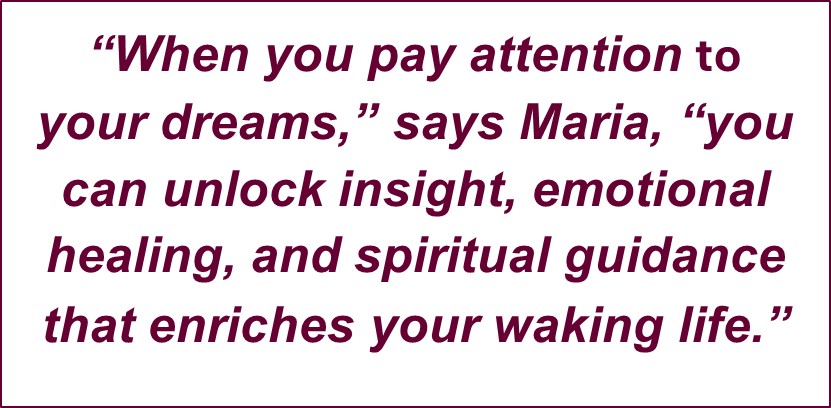“When you pay attention to your dreams,” says Maria, “you can unlock insight, emotional healing, and spiritual guidance that enriches your waking life.” Years ago, Maria was working with someone trained in dream interpretation and began to consistently record her dreams. She quickly started to see recurring patterns and symbols emerge. Maria tried to study Jung directly, but as she now jokes, “There was no way I was going to get through that whole book!”